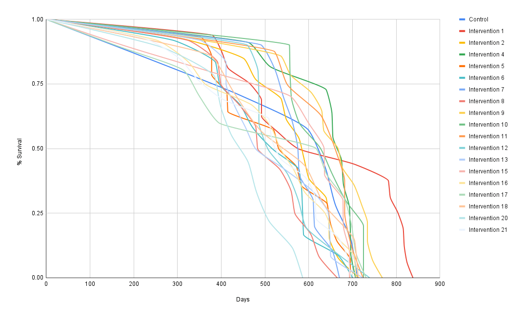 The best intervention was #1 (red line), C60 Olive Oil (the mouse feed was supplemented with about 10% BuckyLabs C60 in organic olive oil). This group also had the largest number of mice (16), so the confidence that something real is happening is greatest with this intervention. The next best group was Intervention 9 (NMN, spermidine, berberine, BHB, ALA, cycloastragenol, dhea, rhodiola, fisetin, icariin, echinacea, cistanche). The following next best interventions are clustered closely around the control, so no conclusions should be made. Surprising that the poorest performer was Intervention #20 (NMN, ALA, pterostilbene, cycloastragenol, centrophenoxine, spermidine, dhea, melatonin, rhodiola, luteolin, fisetin, icariin, echinacea, cistanche, carnitine) which is similar to the 2nd best performer. Also, Intervention #8 (RG7834, dhea, berberine, fisetin, NMN) did not do great. The results with our peptides/proteins did not appear to result in any significant longevity increases. Also, surprising was that the interventions with Rapamycin did not appear to produce significant improvements. Lastly, ours is the first lifespan study to investigate C60 with an alternative lipid, we tried MCT oil (basically coconut), and there was no lifespan improvement.